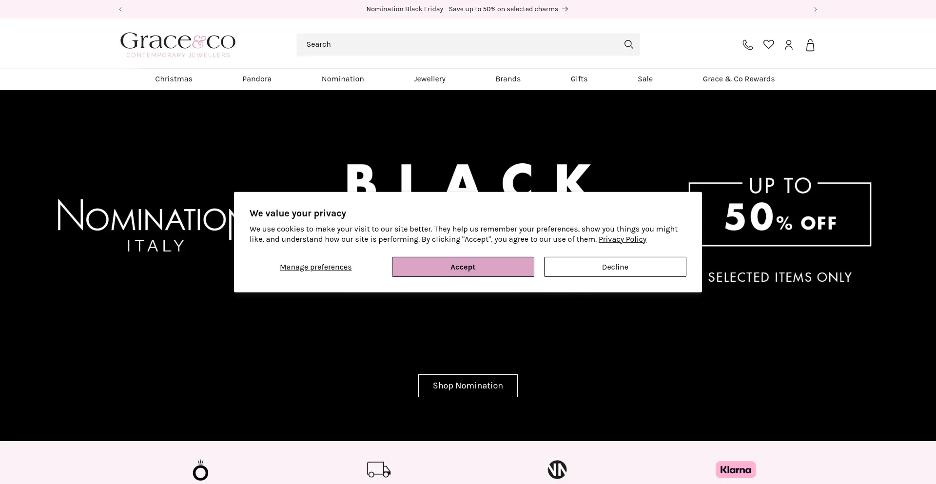 该网站实现符合GDPR或CCPA等隐私法规的cookie同意机制。这表明 graceandcojewellery.co.uk 遵守数据保护标准并为用户提供对个人数据收集实践的控制。