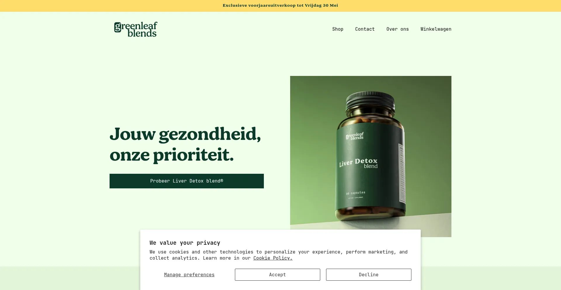 该网站实现符合GDPR或CCPA等隐私法规的cookie同意机制。这表明 greenleafblends.com 遵守数据保护标准并为用户提供对个人数据收集实践的控制。