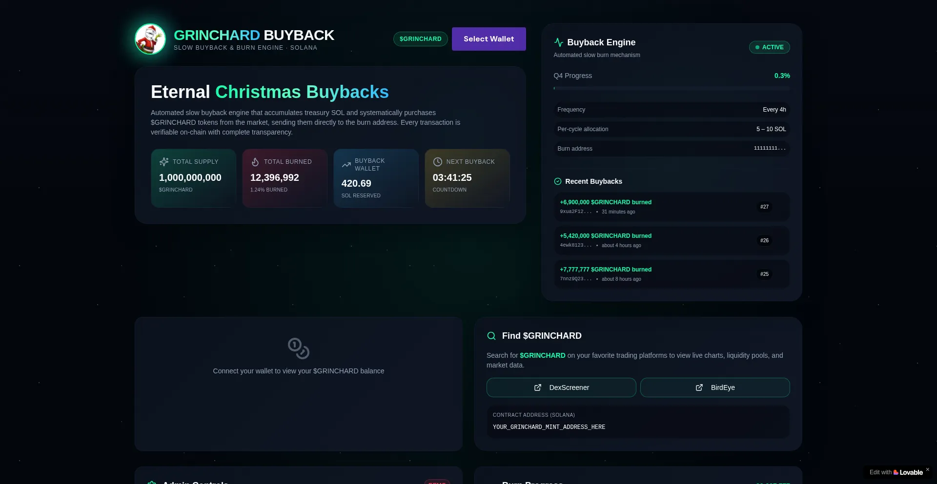 Official $GRINCHARD buyback platform. Automated slow burn engine on Solana with transparent on-chain tracking. Christmas-themed meme token with systematic buyback & burn mechanism.