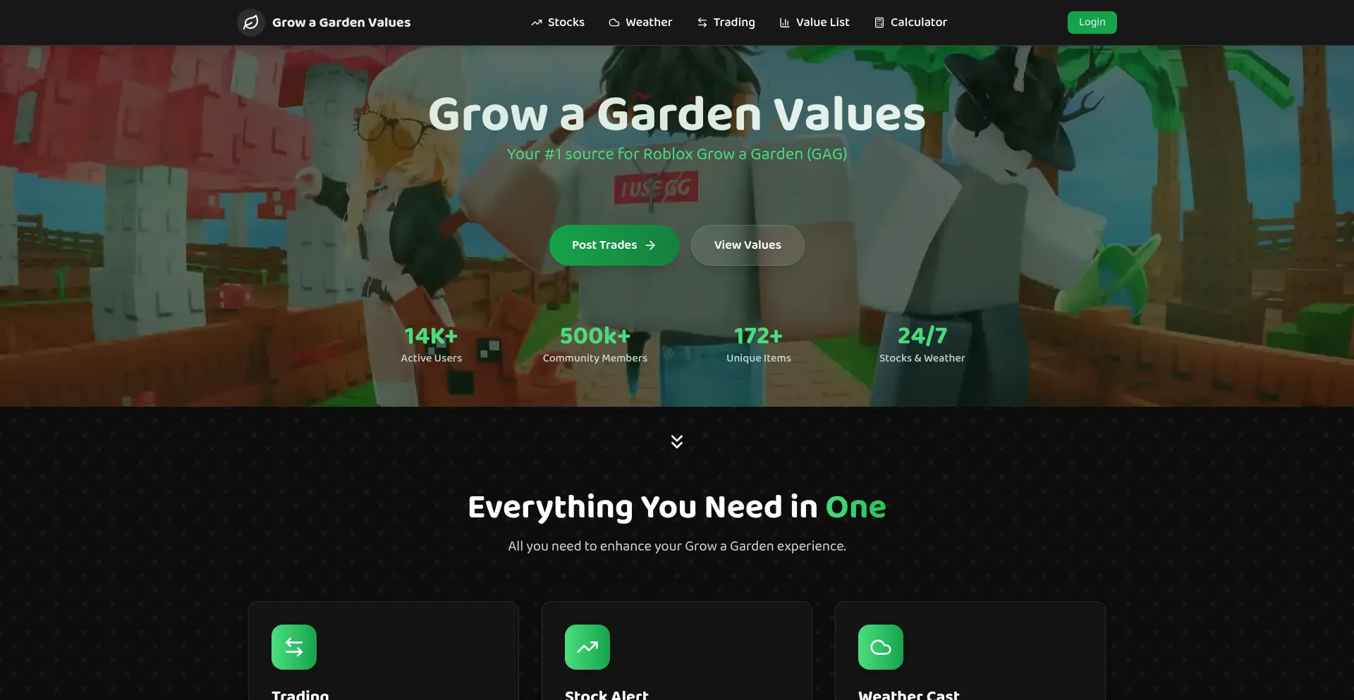 All-in-one website for Roblox Grow a Garden (GAG). Find everything you need about the game, including WFL calculator, value list, trading, stocks, and more!