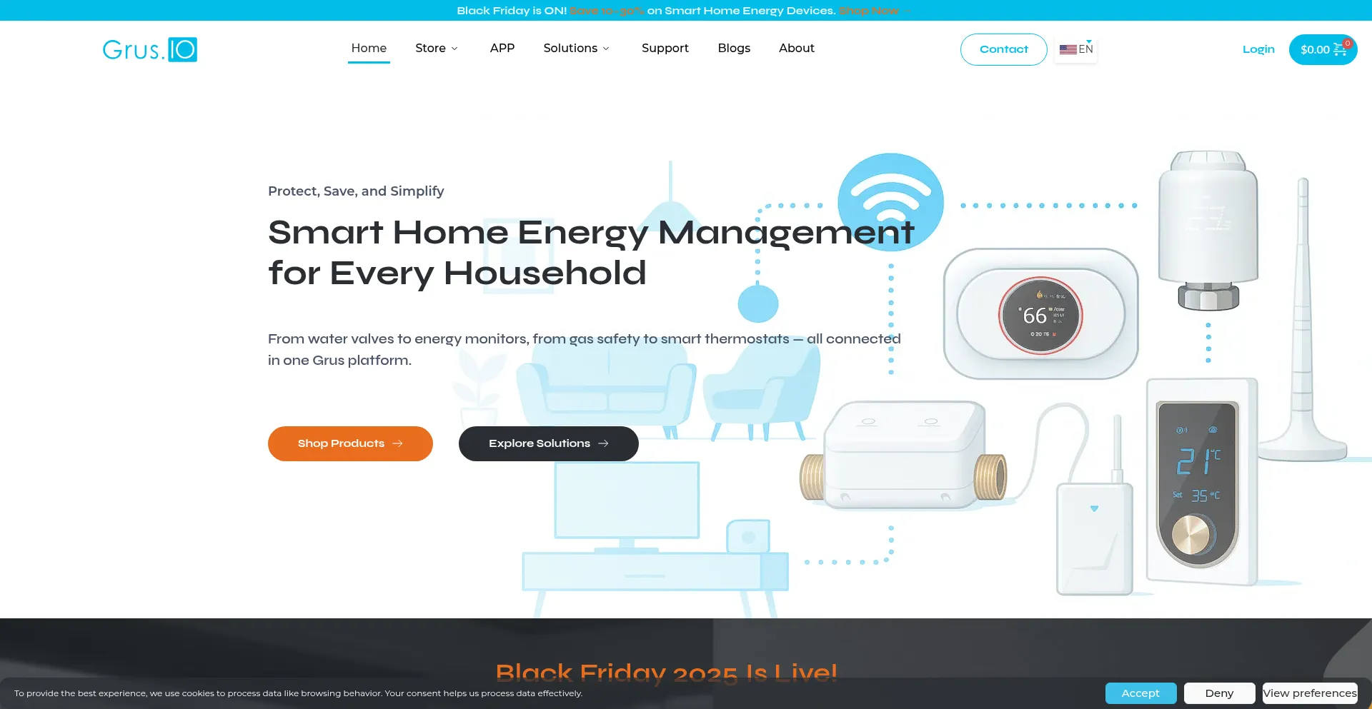 Manage your home’s energy smarter. Grus devices cut bills, prevent water damage, and protect against gas risks — all in one connected platform.