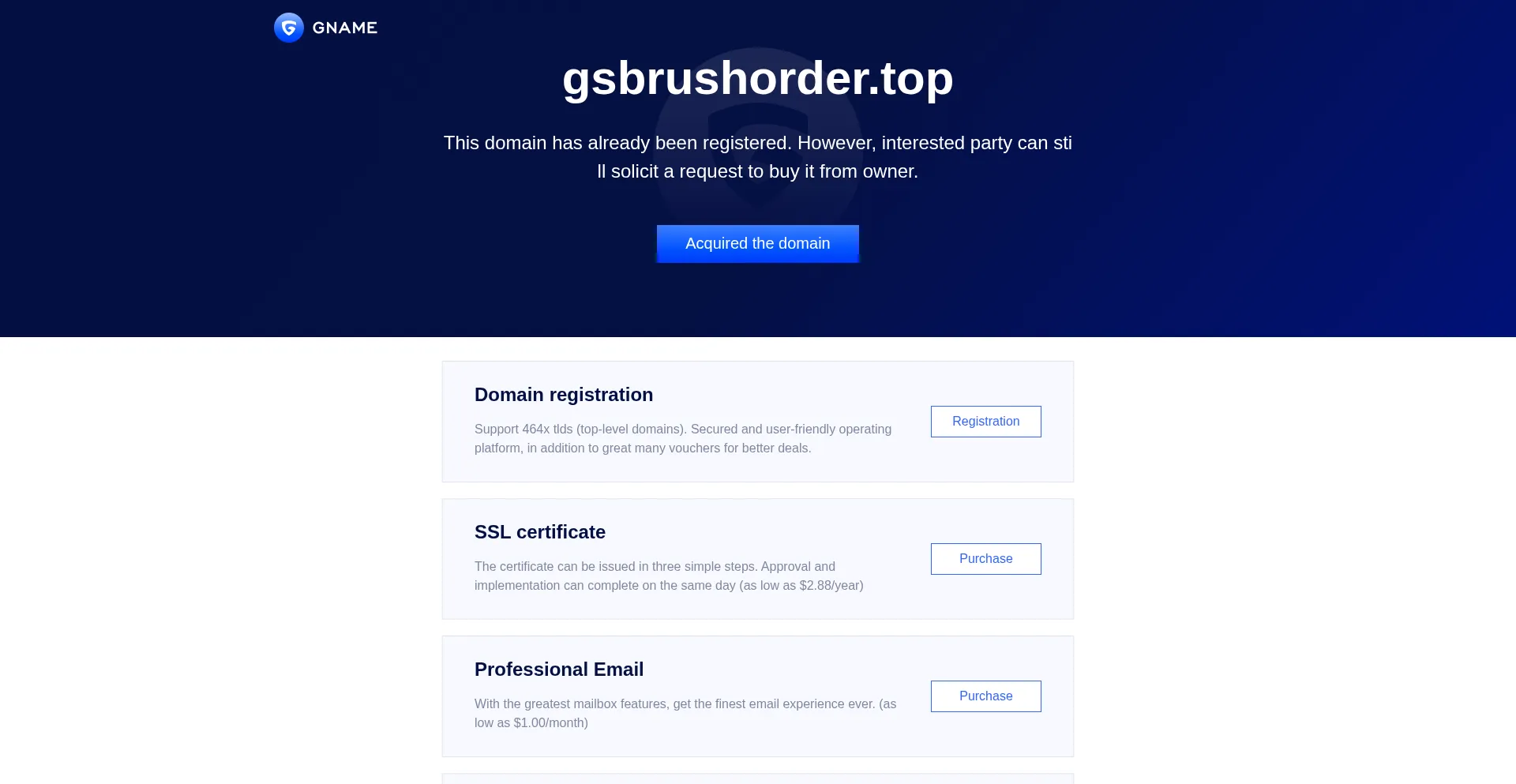 gsbrushorder.top this domain has already been registered. However, interested party can still solicit a request to buy it from owner.