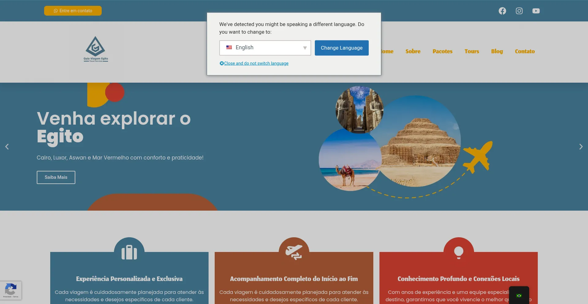 网站上存在社交媒体链接表明 guiaviagemegito.com 在社交媒体上维护官方账户,这是可信度和参与度的积极信号。