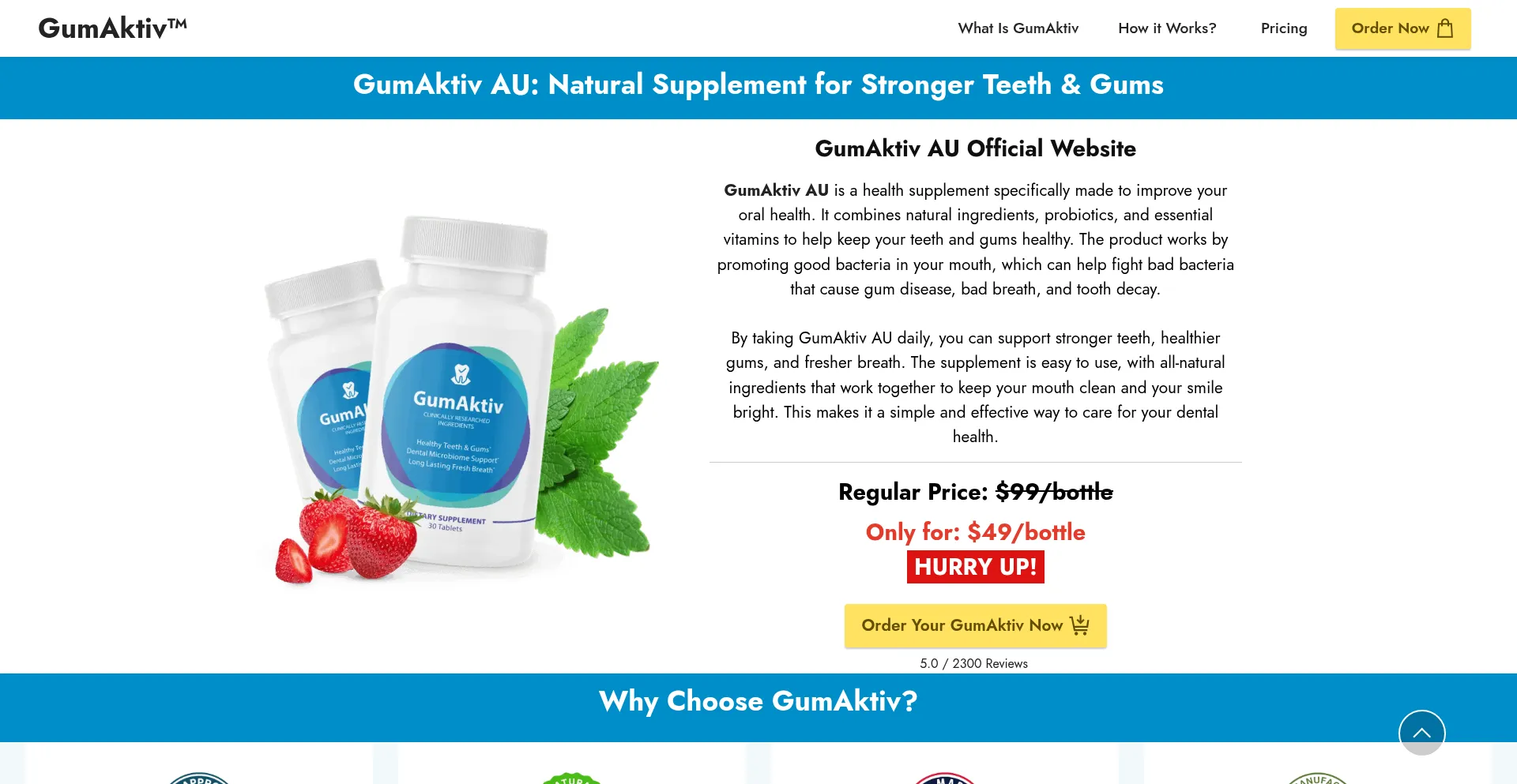 GumAktiv AU, natural dental health supplement outlined to improve gum health, freshen breath, and strengthen teeth with clinically proven organic ingredients.