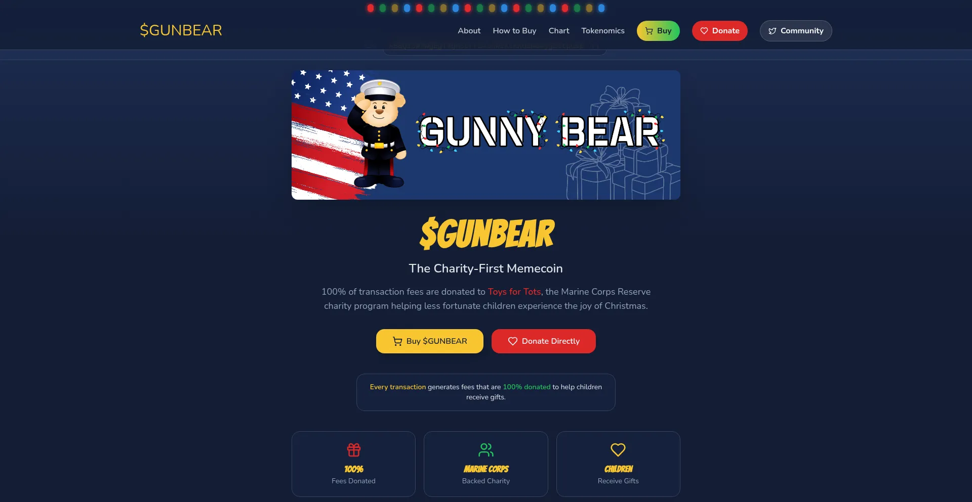 $GUNBEAR is the official meme token supporting Toys for Tots USA. 100% of fees donated to help children receive gifts every Christmas. Join the giving community!