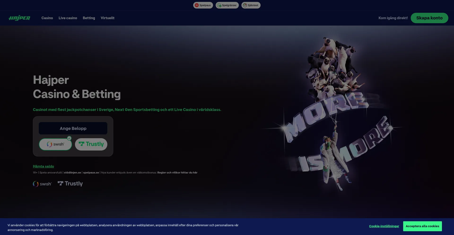 Hajper är ett spelbolag med casino & betting med Swish-uttag. Just nu 300% bonus på casino eller sportbonus upp till 500 kr. Swish & BankID✅