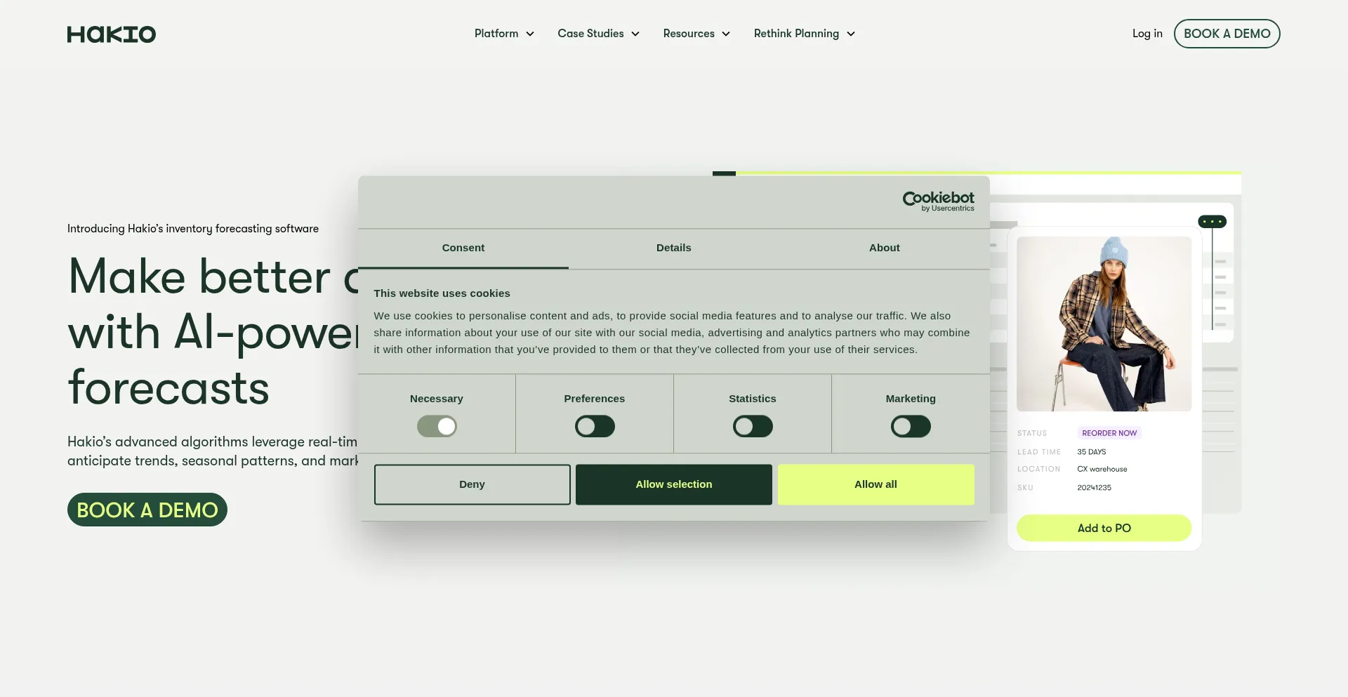 该网站实现符合GDPR或CCPA等隐私法规的cookie同意机制。这表明 hakio.com 遵守数据保护标准并为用户提供对个人数据收集实践的控制。