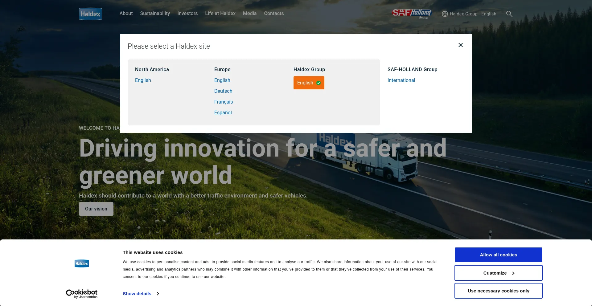 网站上存在社交媒体链接表明 haldex.com 在社交媒体上维护官方账户,这是可信度和参与度的积极信号。