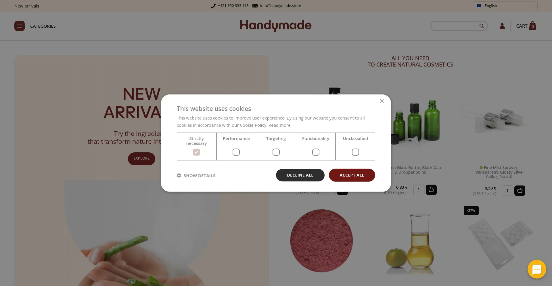 该网站实现符合GDPR或CCPA等隐私法规的cookie同意机制。这表明 handymade.store 遵守数据保护标准并为用户提供对个人数据收集实践的控制。