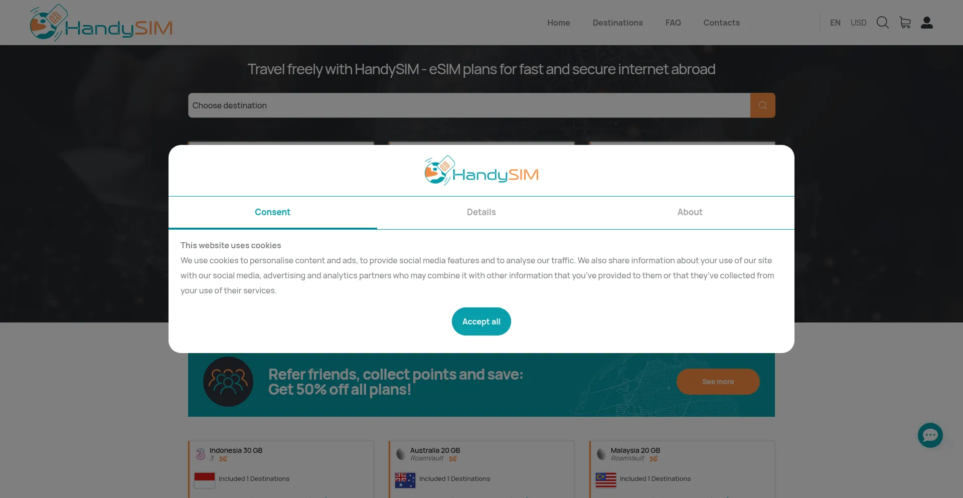 该网站实现符合GDPR或CCPA等隐私法规的cookie同意机制。这表明 handysim.com 遵守数据保护标准并为用户提供对个人数据收集实践的控制。