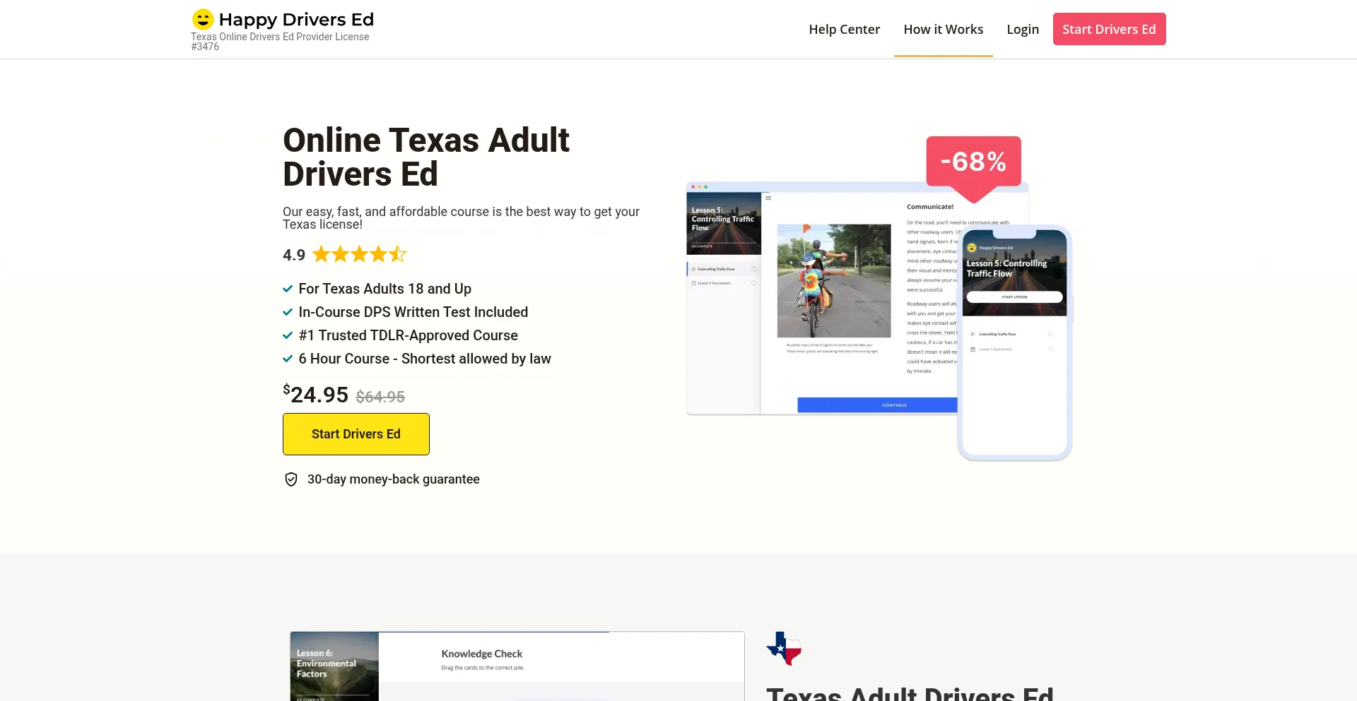 Discover the best way to complete your Texas Adult Drivers Ed with Happy Drivers Ed! Our engaging online course is designed to help you get your license.