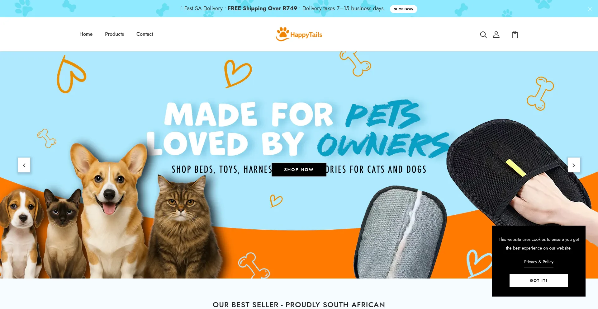 Shop premium pet accessories for dogs and cats at Happy Tails. Beds, toys, bowls, harnesses and more. Great prices, fast SA delivery and secure checkout. Give your pet the comfo...