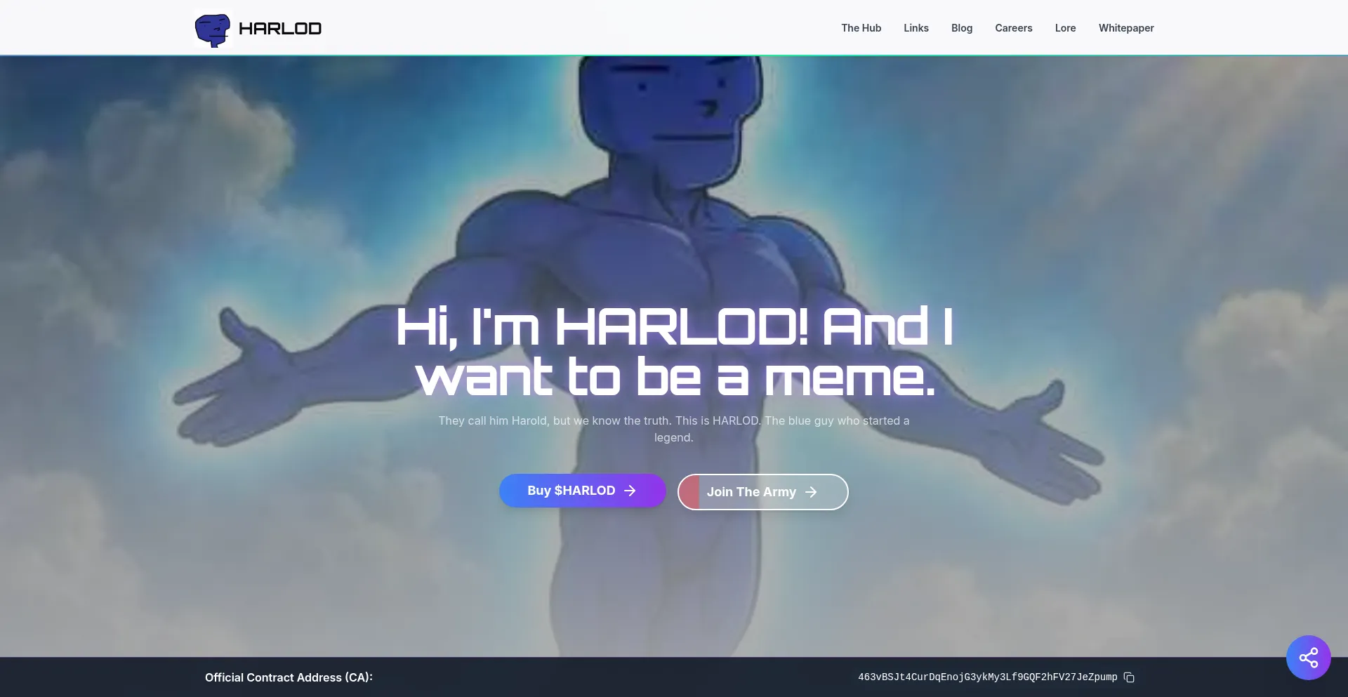 Welcome to the official hub for HARLOD, the blue guy meme token on the Solana blockchain. Not to be confused with Harold. Explore our merch, meme factory, and token utility.