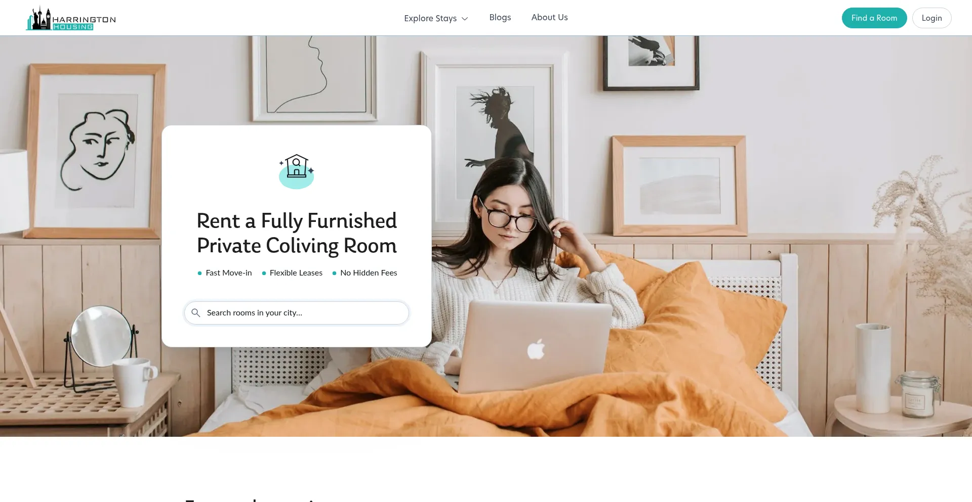 Find affordable furnished rooms and coliving spaces in top US and UK cities: flexible leases, all-inclusive rent, and move-in ready homes with Harrington Housing.