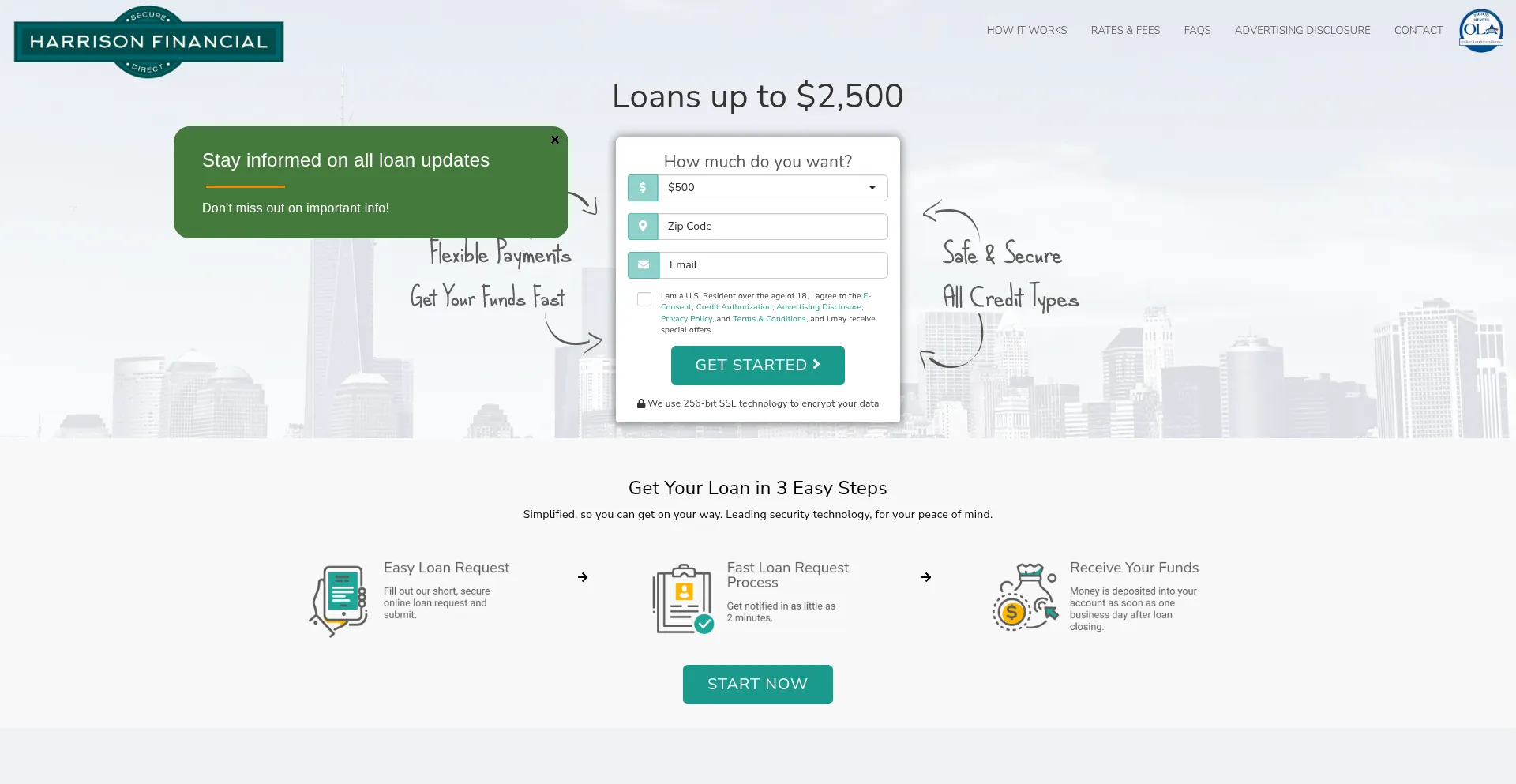 该网站实现数据收集表单,请求个人信息,包括姓名、电子邮件地址、电话号码或其他敏感详细信息。用户应验证 harrison-financial.com 的合法性并在提交个人数据前查看隐私政策。
