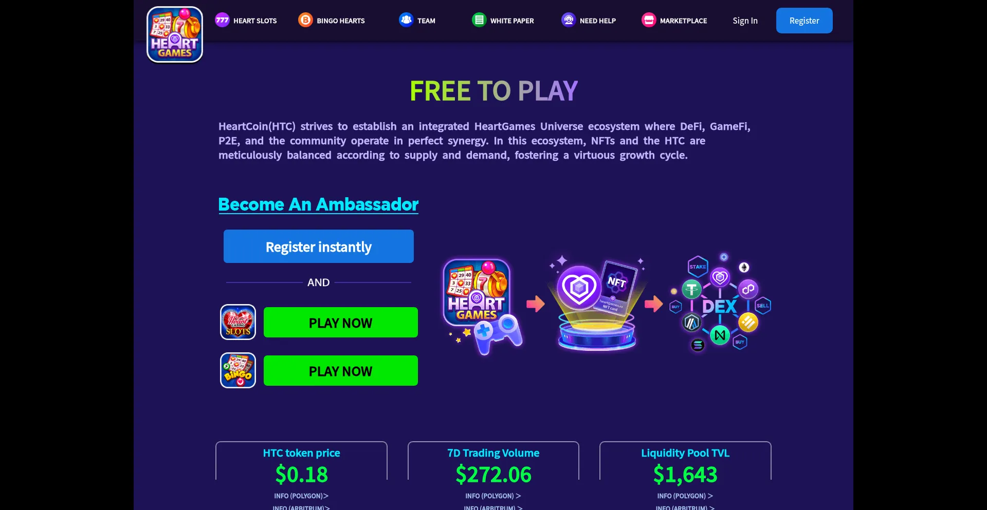 HeartGames proposes a P2E model by adoption of DeFi monetization with focus on NFT. HeartCoin is intended for using with the NFTs through P2E gameplay