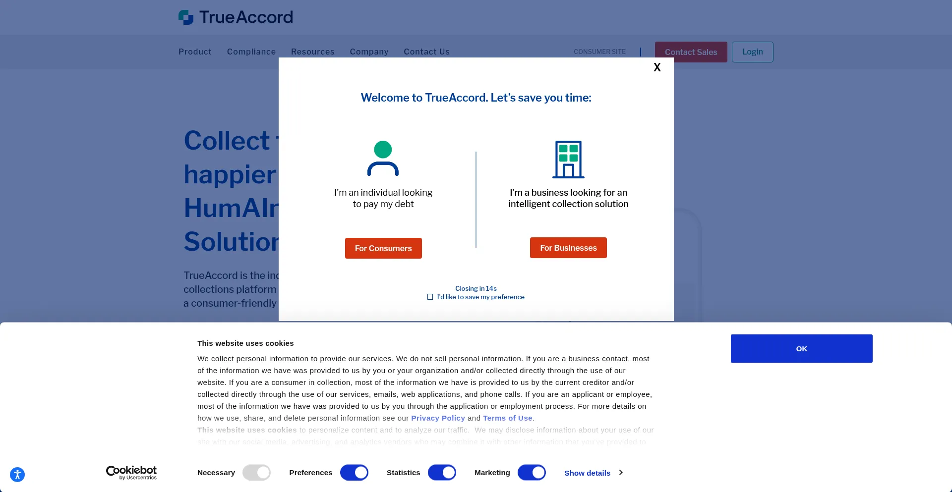 该网站实现符合GDPR或CCPA等隐私法规的cookie同意机制。这表明 hello.trueaccord.com 遵守数据保护标准并为用户提供对个人数据收集实践的控制。