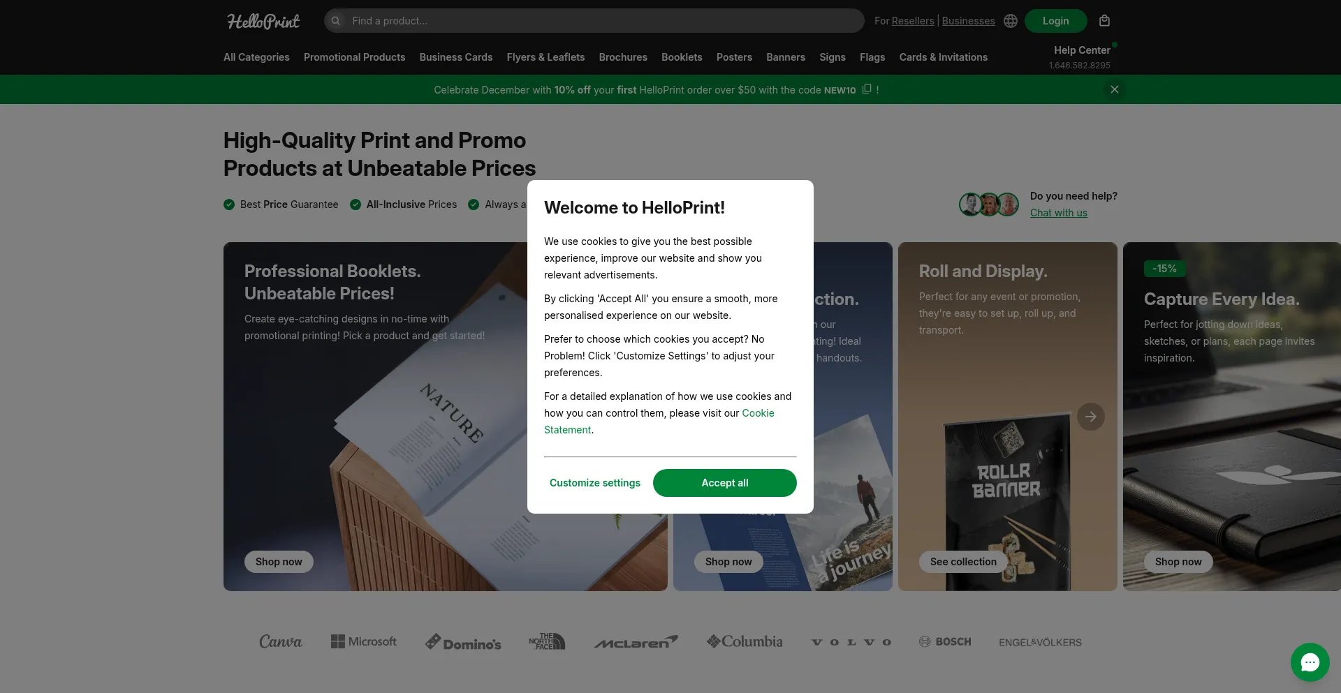该网站实现符合GDPR或CCPA等隐私法规的cookie同意机制。这表明 helloprint.com 遵守数据保护标准并为用户提供对个人数据收集实践的控制。