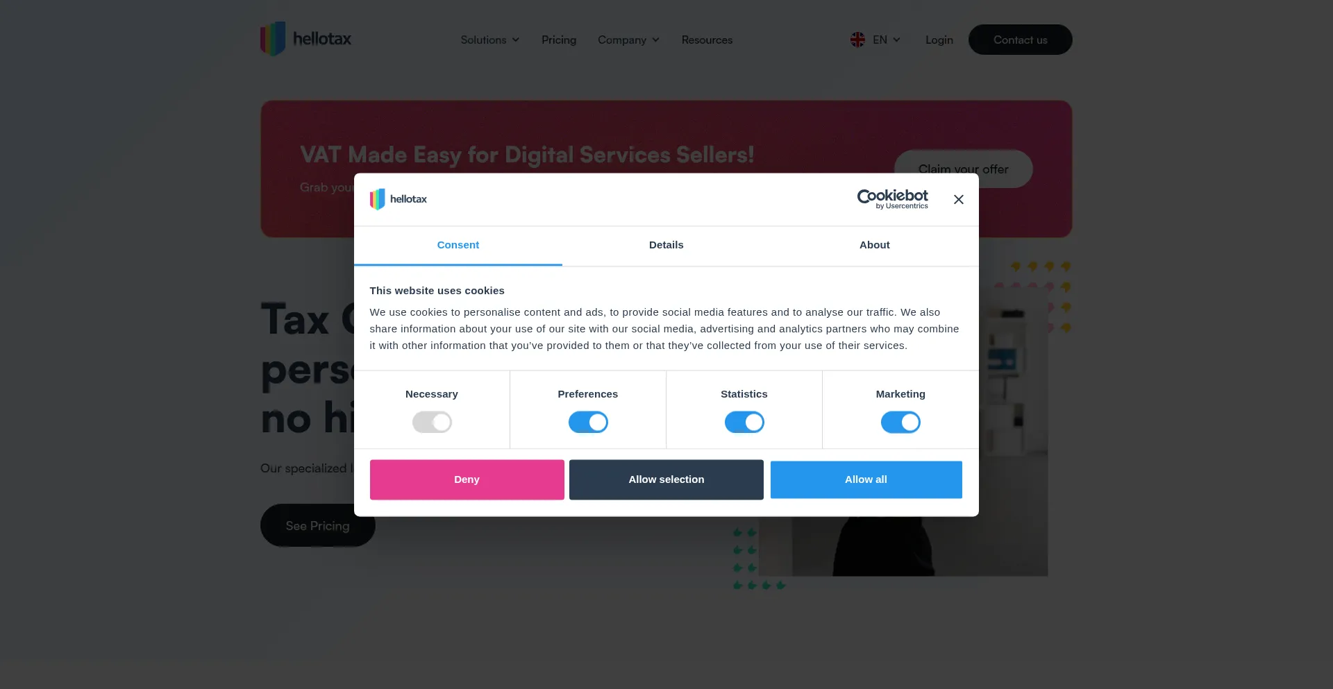 该网站实现符合GDPR或CCPA等隐私法规的cookie同意机制。这表明 hellotax.com 遵守数据保护标准并为用户提供对个人数据收集实践的控制。
