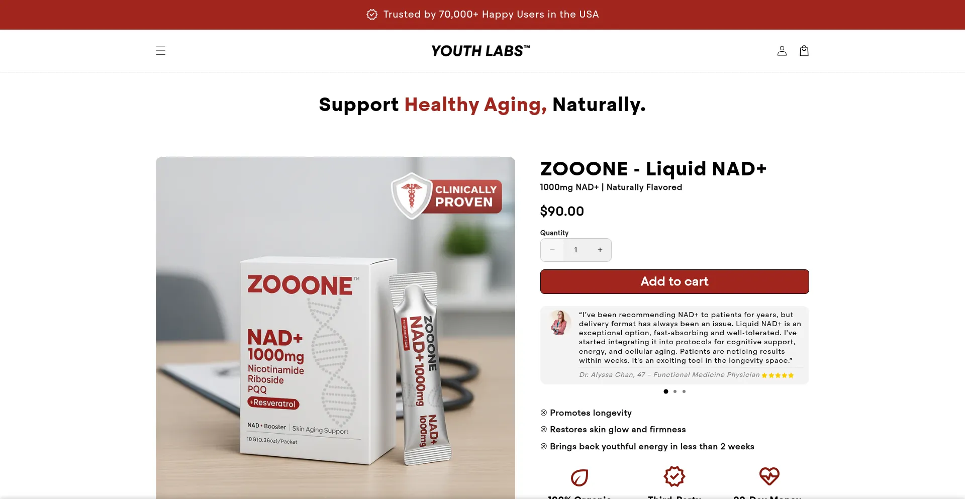 ZOOONE Liquid NAD+ helps thousands of men and women over 40 restore their glow, reduce deep wrinkles, feel confident and full of energy again.