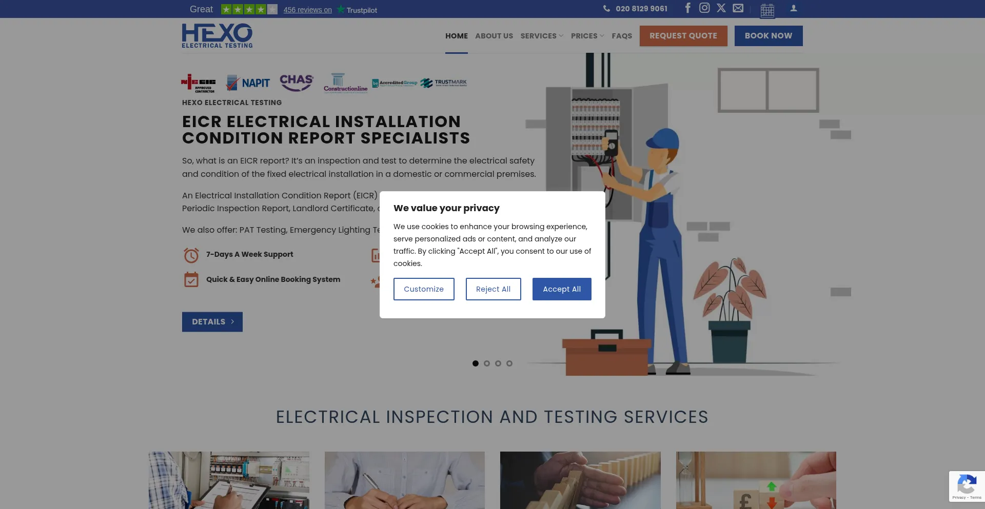 该网站实现符合GDPR或CCPA等隐私法规的cookie同意机制。这表明 hexoelectricaltesting.co.uk 遵守数据保护标准并为用户提供对个人数据收集实践的控制。