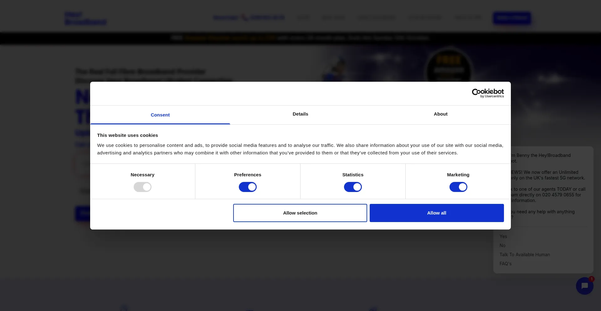 该网站实现符合GDPR或CCPA等隐私法规的cookie同意机制。这表明 heybroadband.co.uk 遵守数据保护标准并为用户提供对个人数据收集实践的控制。