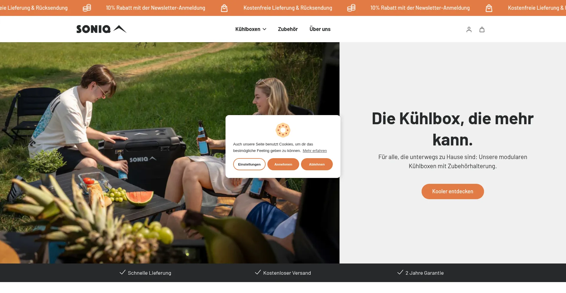 Hochwertige Kompressor- und passive Kühlboxen von Soniq. Modular, leise & ideal für Vanlife, Reisen oder Outdoor-Abenteuer. Kostenloser Versand und Rückgabe, 2 Jahre Garantie...