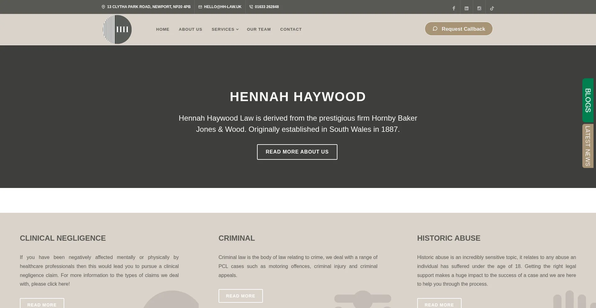 网站上存在社交媒体链接表明 hh-law.uk 在社交媒体上维护官方账户,这是可信度和参与度的积极信号。