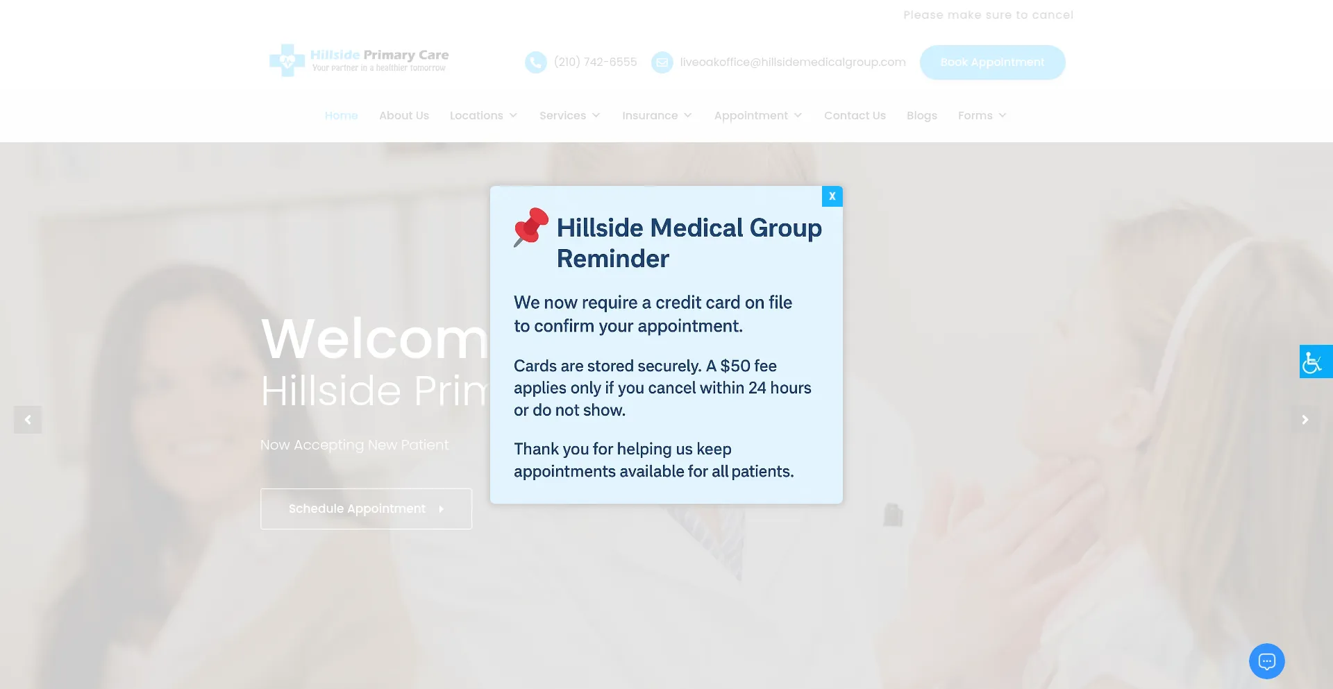 该网站实现数据收集表单,请求个人信息,包括姓名、电子邮件地址、电话号码或其他敏感详细信息。用户应验证 hillsideprimarycare.com 的合法性并在提交个人数据前查看隐私政策。