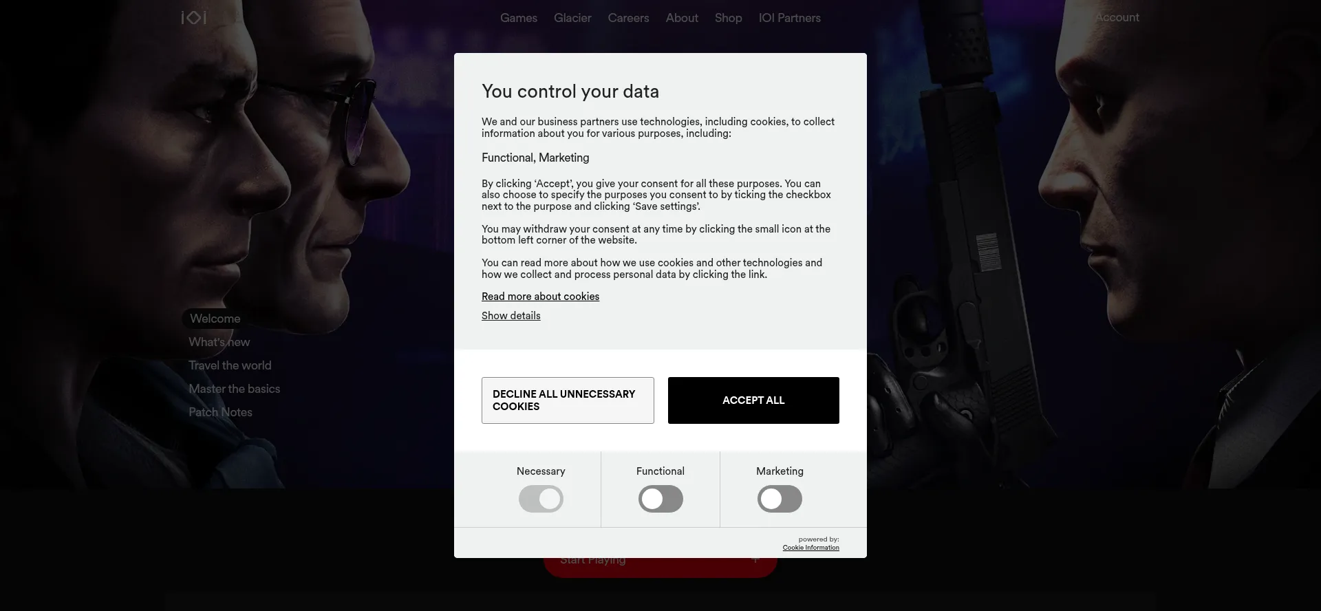 该网站实现符合GDPR或CCPA等隐私法规的cookie同意机制。这表明 hitman.com 遵守数据保护标准并为用户提供对个人数据收集实践的控制。
