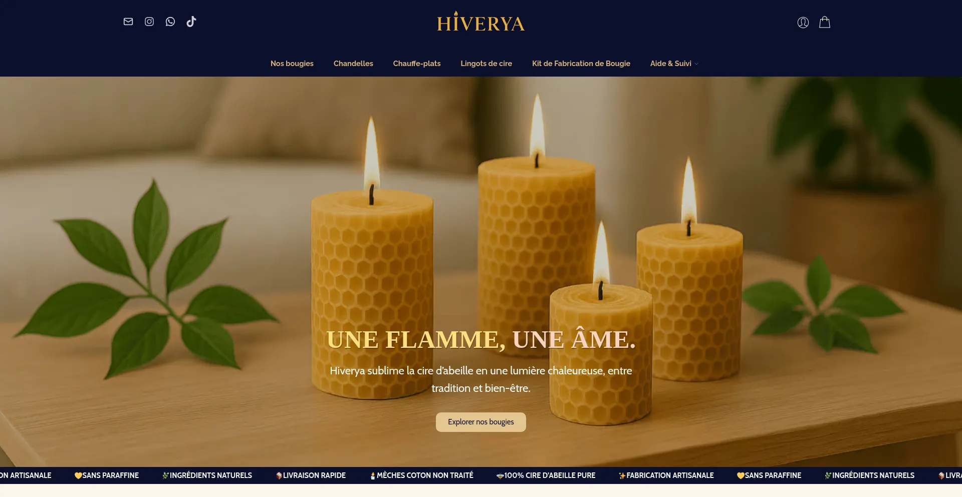 Découvrez les bougies Hiverya, 100 % cire d’abeille naturelle. Artisanales, durables et parfumées, elles apportent chaleur, bien-être et élégance à votre intérieur.