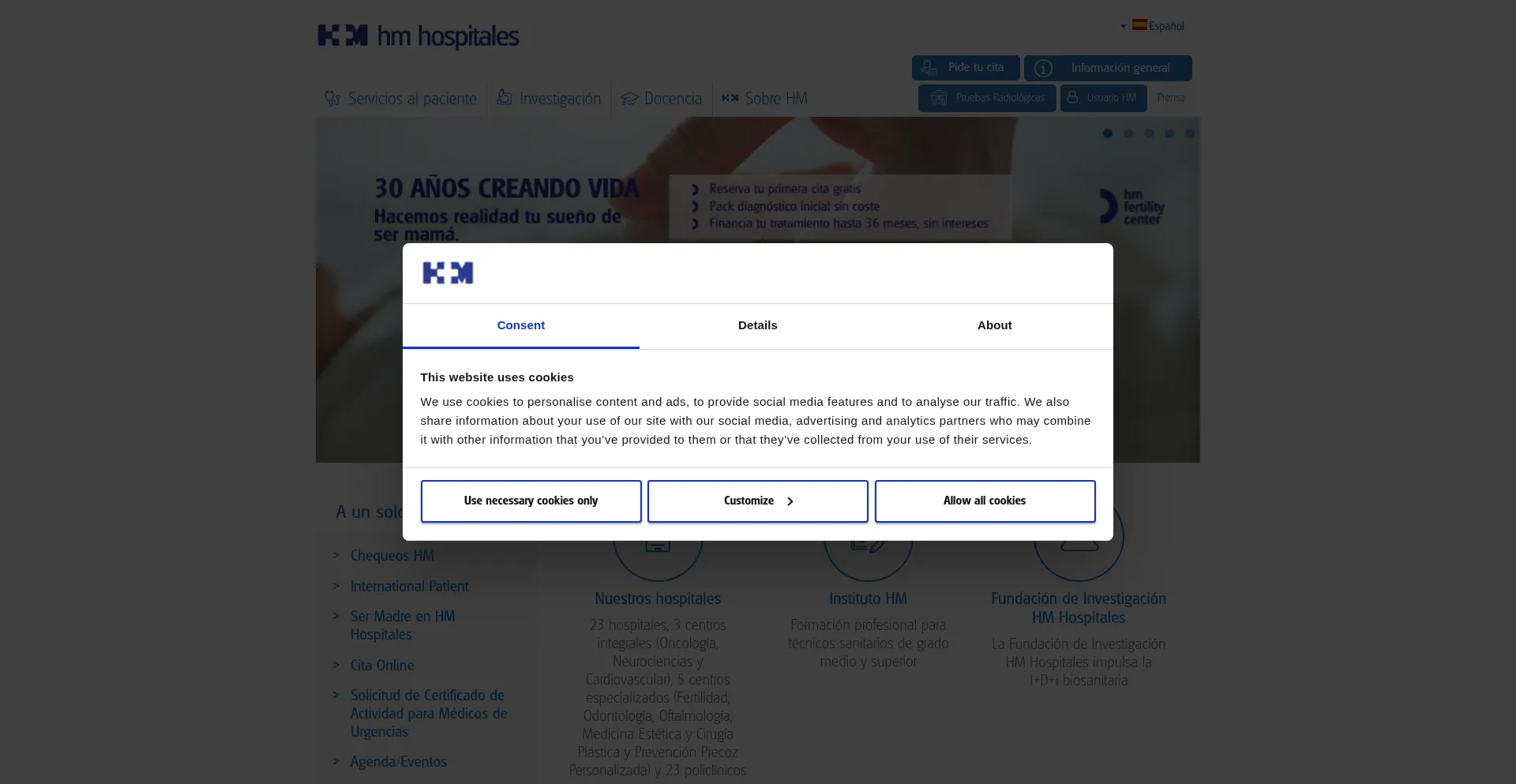 该网站实现符合GDPR或CCPA等隐私法规的cookie同意机制。这表明 hmhospitales.com 遵守数据保护标准并为用户提供对个人数据收集实践的控制。