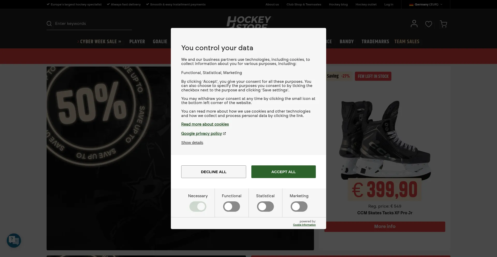 该网站实现符合GDPR或CCPA等隐私法规的cookie同意机制。这表明 hockeystore.com 遵守数据保护标准并为用户提供对个人数据收集实践的控制。