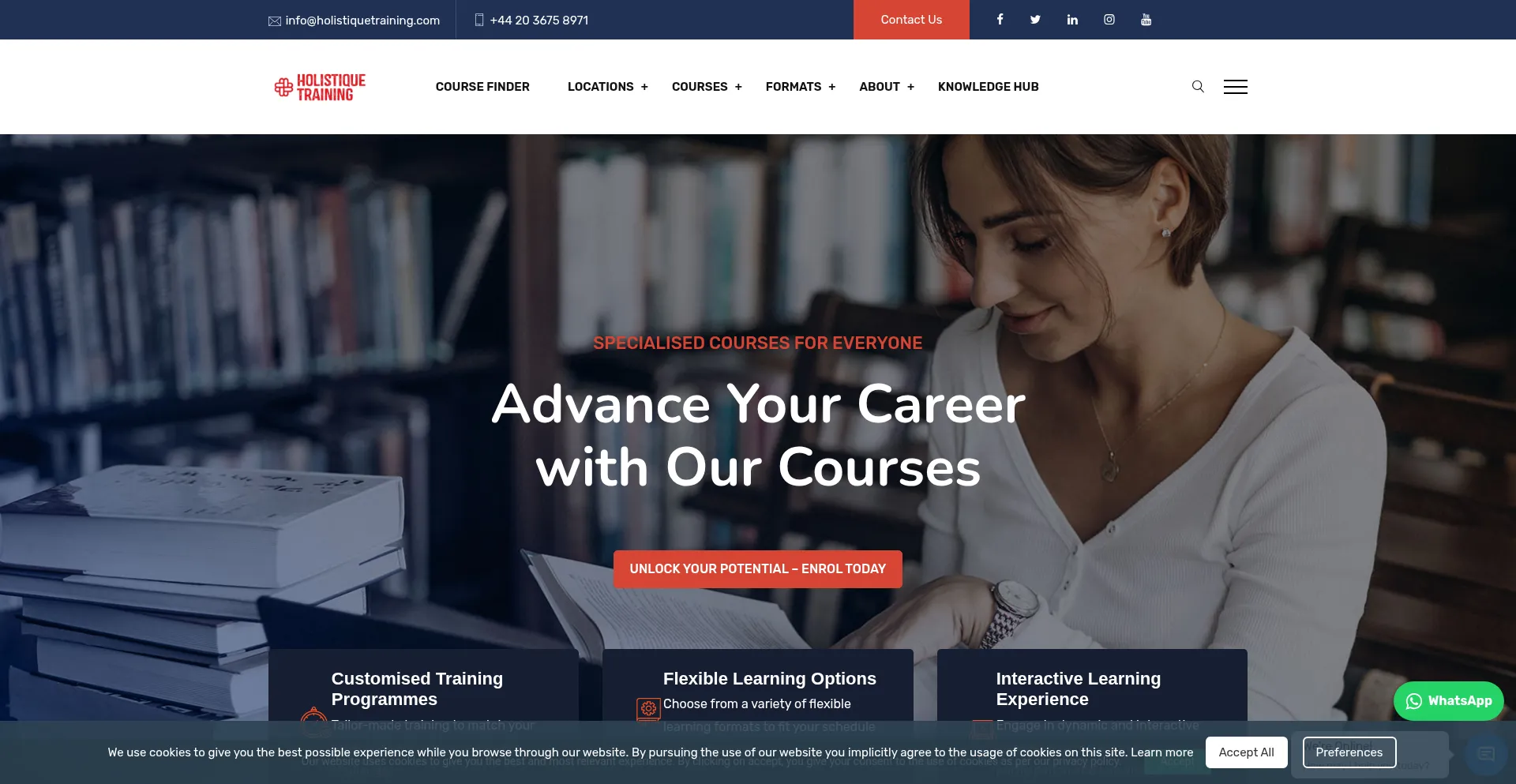 holistiquetraining.com 使用 Bootstrap,这是一个广泛采用的开源响应式网页开发框架。Bootstrap 通过标准化组件和样式实现移动友好界面的高效创建。