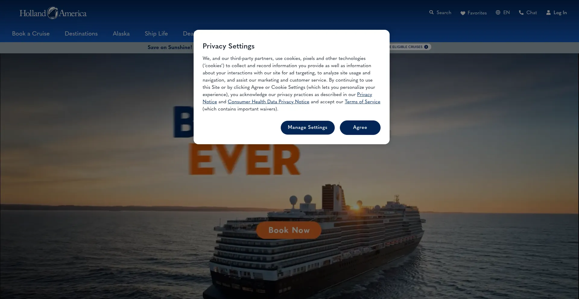 该网站实现符合GDPR或CCPA等隐私法规的cookie同意机制。这表明 hollandamerica.com 遵守数据保护标准并为用户提供对个人数据收集实践的控制。