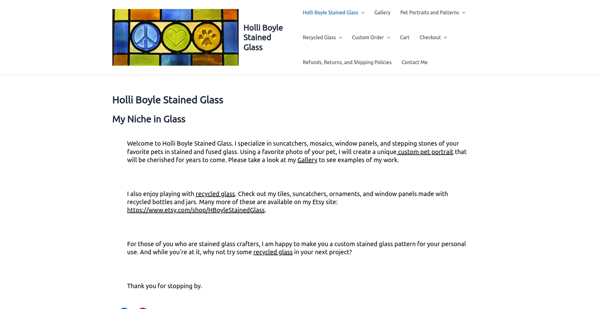 Holli Boyle Stained Glass offers stained & fused glass pet portraits, as well as panels, suncatchers, ornaments, and tiles in recycled glass.
