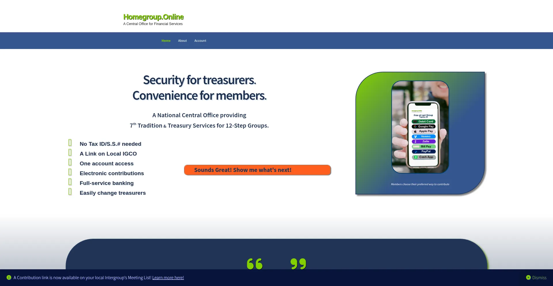 Security for treasurers. Convenience for members. A National Central Office providing 7th Tradition & Treasury Services for 12-Step Groups. ★ No Tax ID/S.S.# needed ★ A Link...