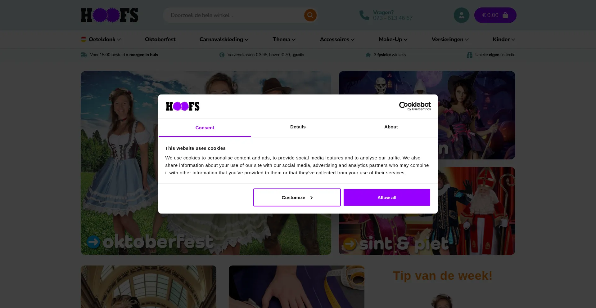 该网站实现符合GDPR或CCPA等隐私法规的cookie同意机制。这表明 hoofs-feestkleding.nl 遵守数据保护标准并为用户提供对个人数据收集实践的控制。