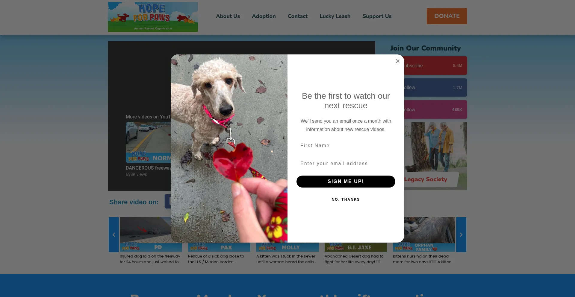 网站上存在社交媒体链接表明 hopeforpaws.org 在社交媒体上维护官方账户,这是可信度和参与度的积极信号。