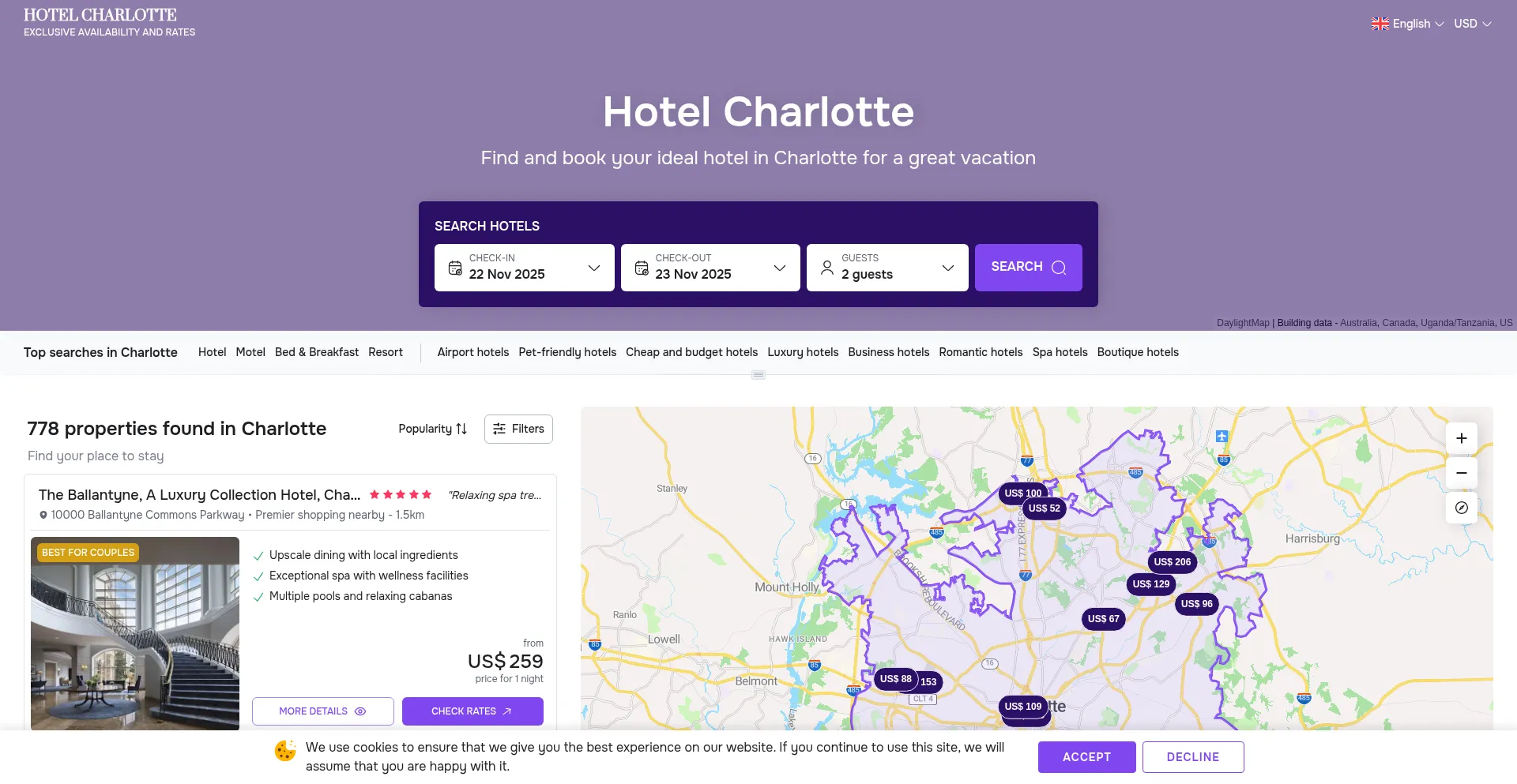 With Hotel Charlotte, find the best hotels in Charlotte offering the best rates and comfortable stays. Book now for exclusive deals and enjoy your visit to Charlotte!