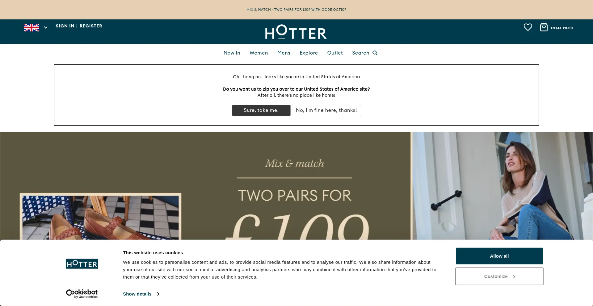 该网站实现符合GDPR或CCPA等隐私法规的cookie同意机制。这表明 hotter.com 遵守数据保护标准并为用户提供对个人数据收集实践的控制。