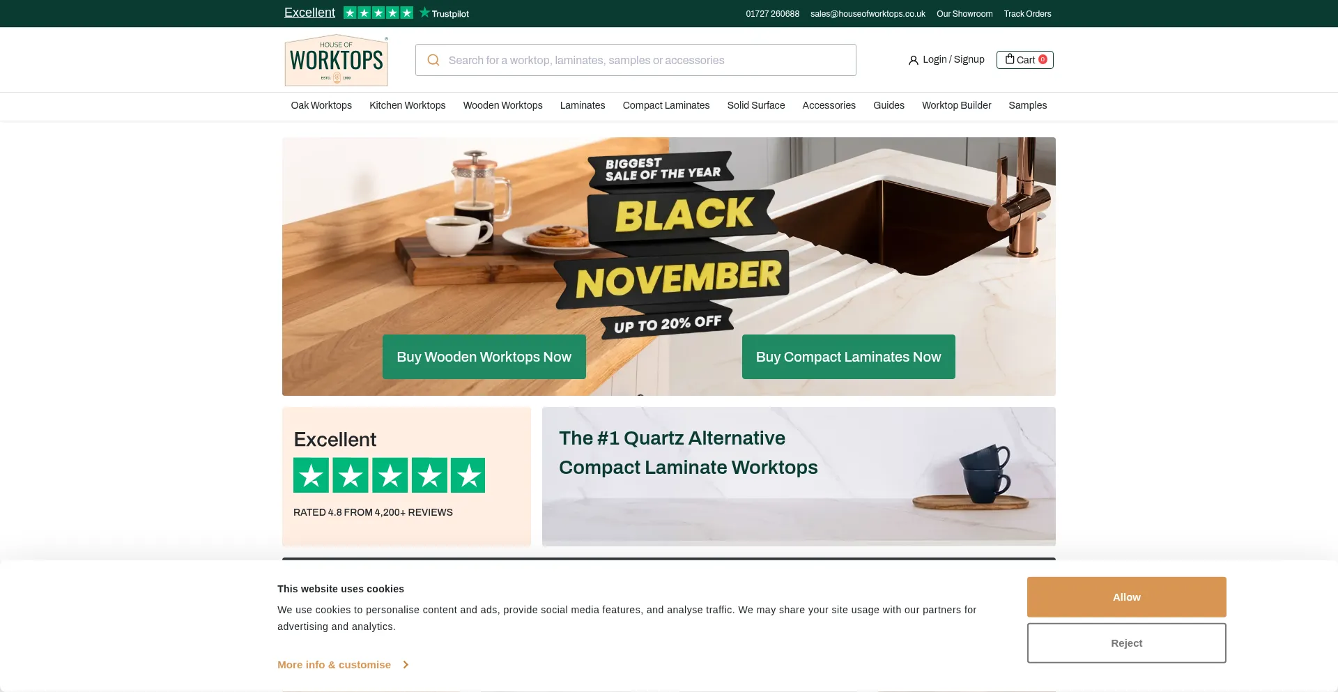 该网站实现符合GDPR或CCPA等隐私法规的cookie同意机制。这表明 houseofworktops.co.uk 遵守数据保护标准并为用户提供对个人数据收集实践的控制。