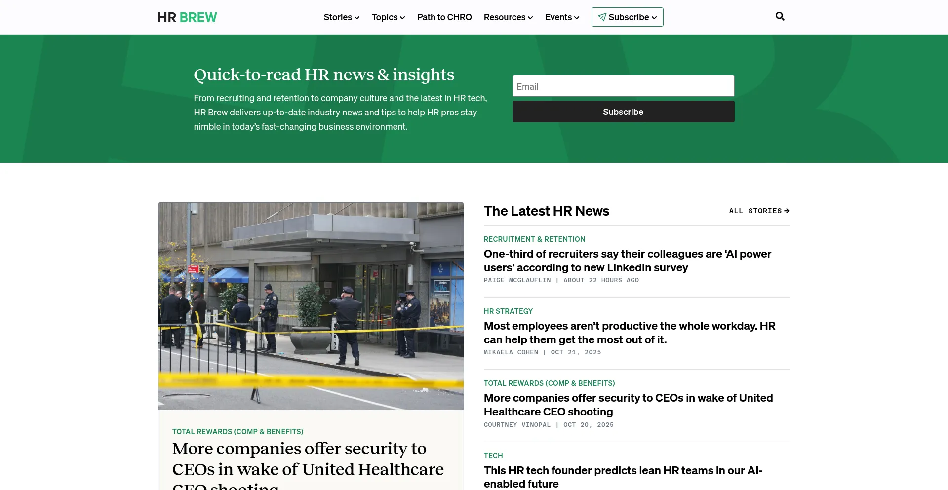 From recruiting and retention to company culture and the latest in HR tech, HR Brew delivers up-to-date industry news and tips to help HR pros stay nimble in today’s fast-chan...