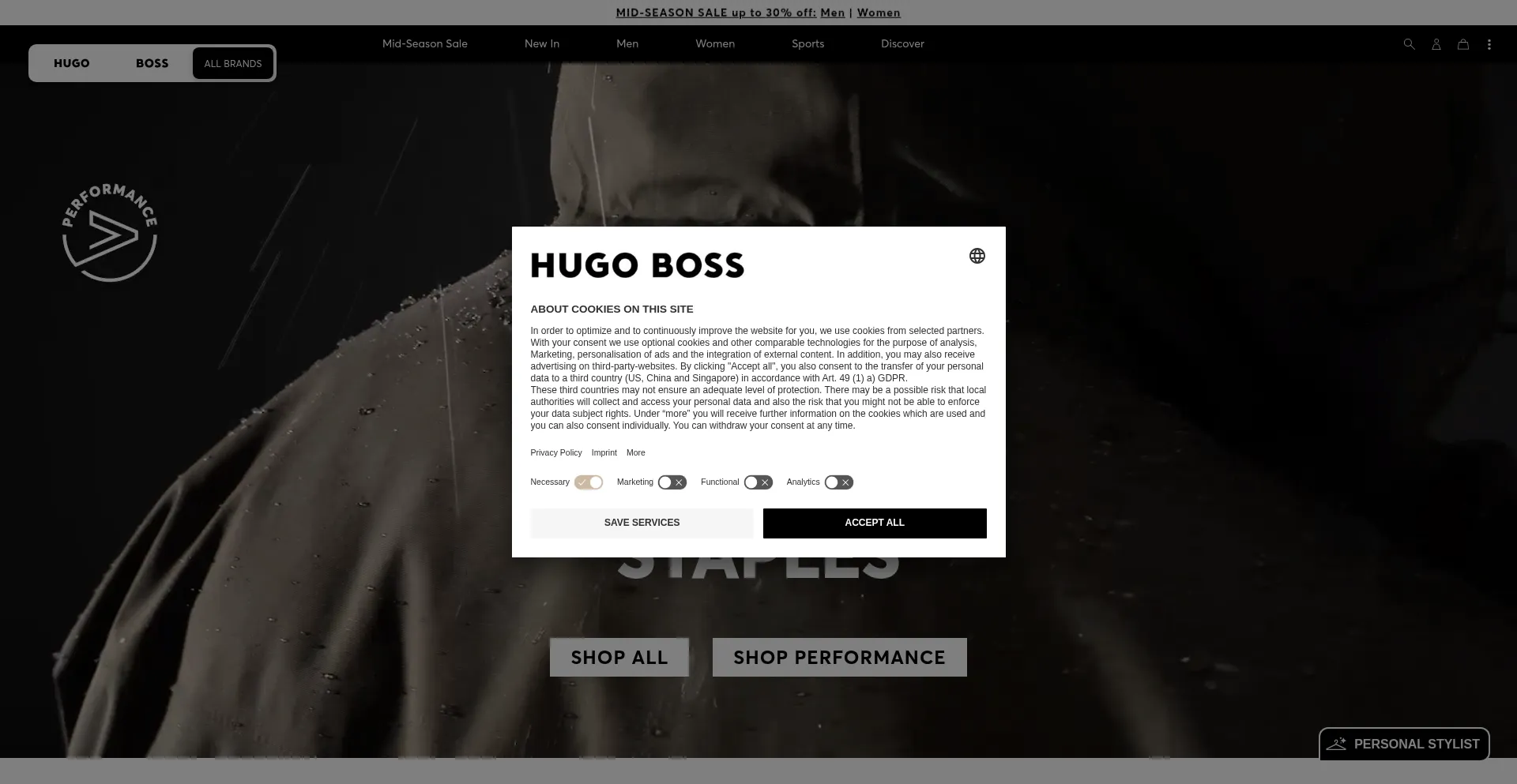 该网站实现符合GDPR或CCPA等隐私法规的cookie同意机制。这表明 hugoboss.co.uk 遵守数据保护标准并为用户提供对个人数据收集实践的控制。