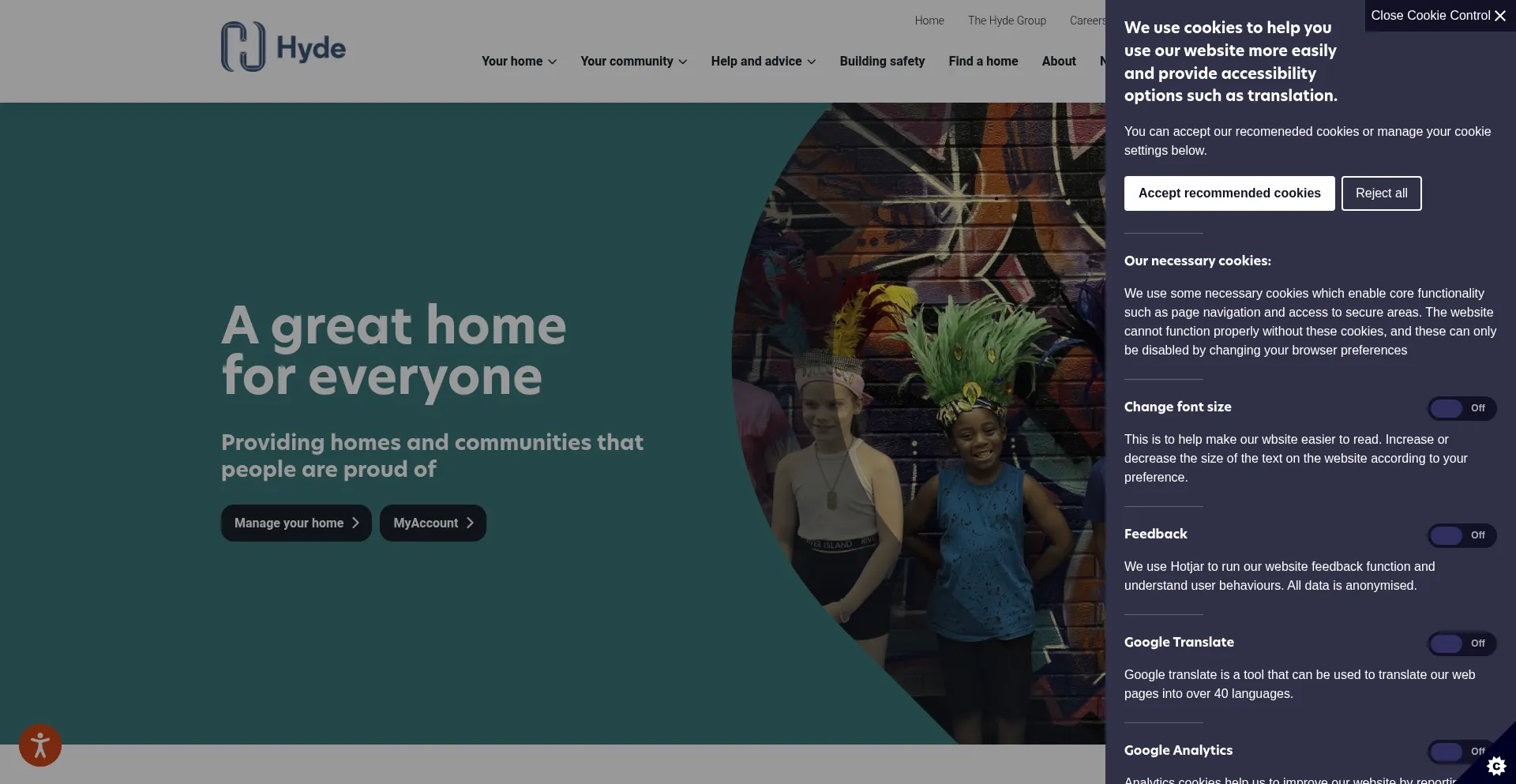该网站实现符合GDPR或CCPA等隐私法规的cookie同意机制。这表明 hyde-housing.co.uk 遵守数据保护标准并为用户提供对个人数据收集实践的控制。