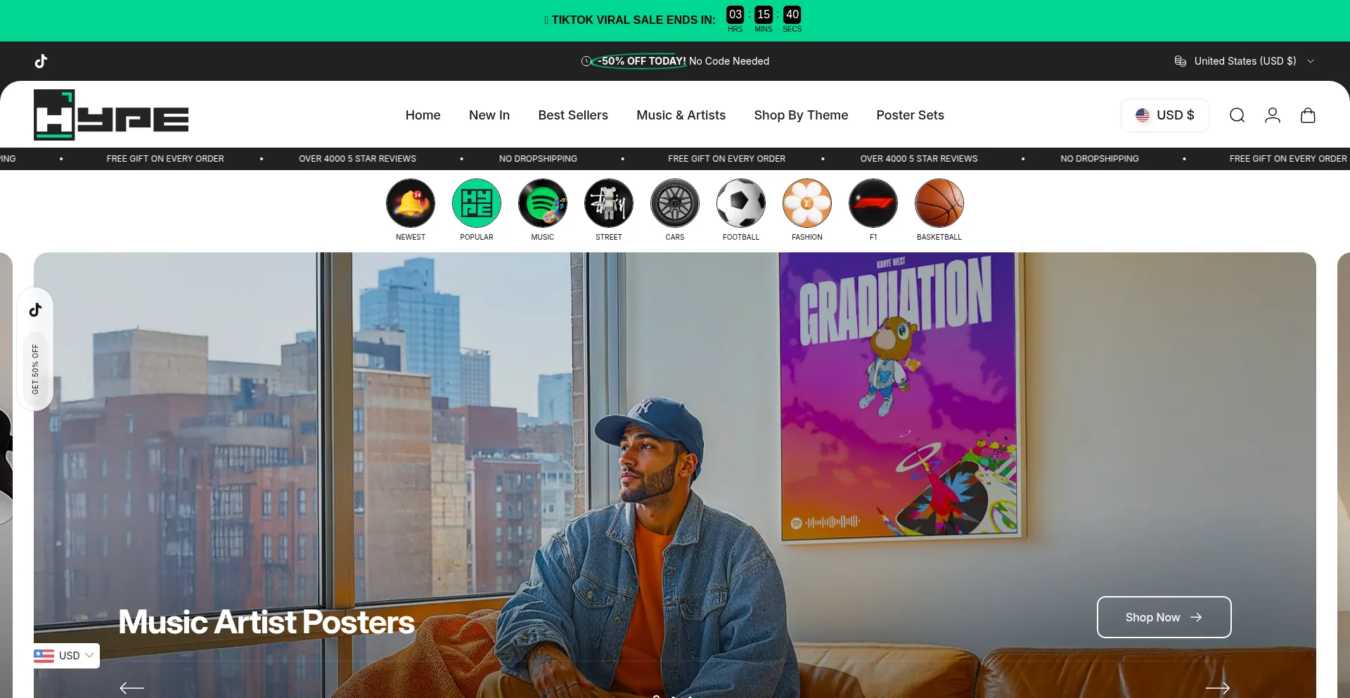 该网站利用流行产品名称和品牌来吸引流量并产生用户兴趣。这些产品可能通过促销活动或折扣策略提供,旨在增加 hypepostersco.com 的访客参与度和转化率。