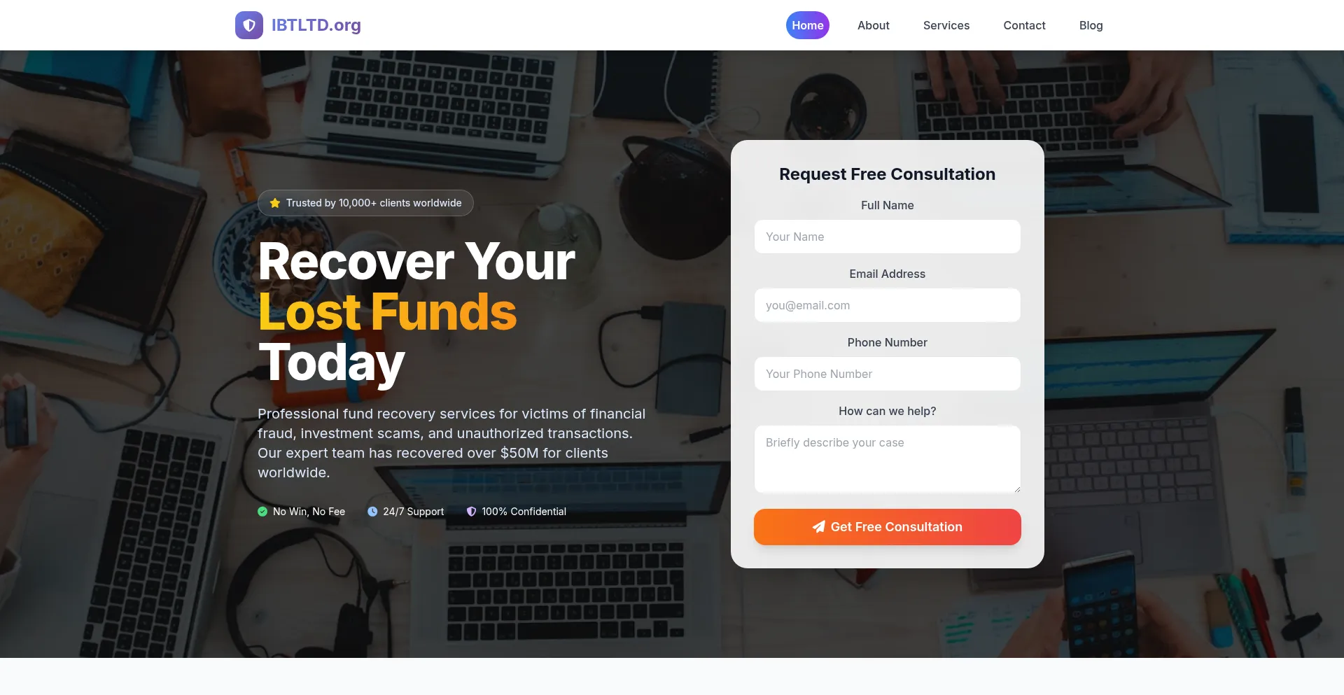 网站 ibtltd.org 宣传针对丢失或被盗资产的资金恢复服务。虽然一些在应急费用结构上运营,其他可能需要预付款,这可能表明欺诈运营。在聘请此类服务前验证凭据和监管合规性。