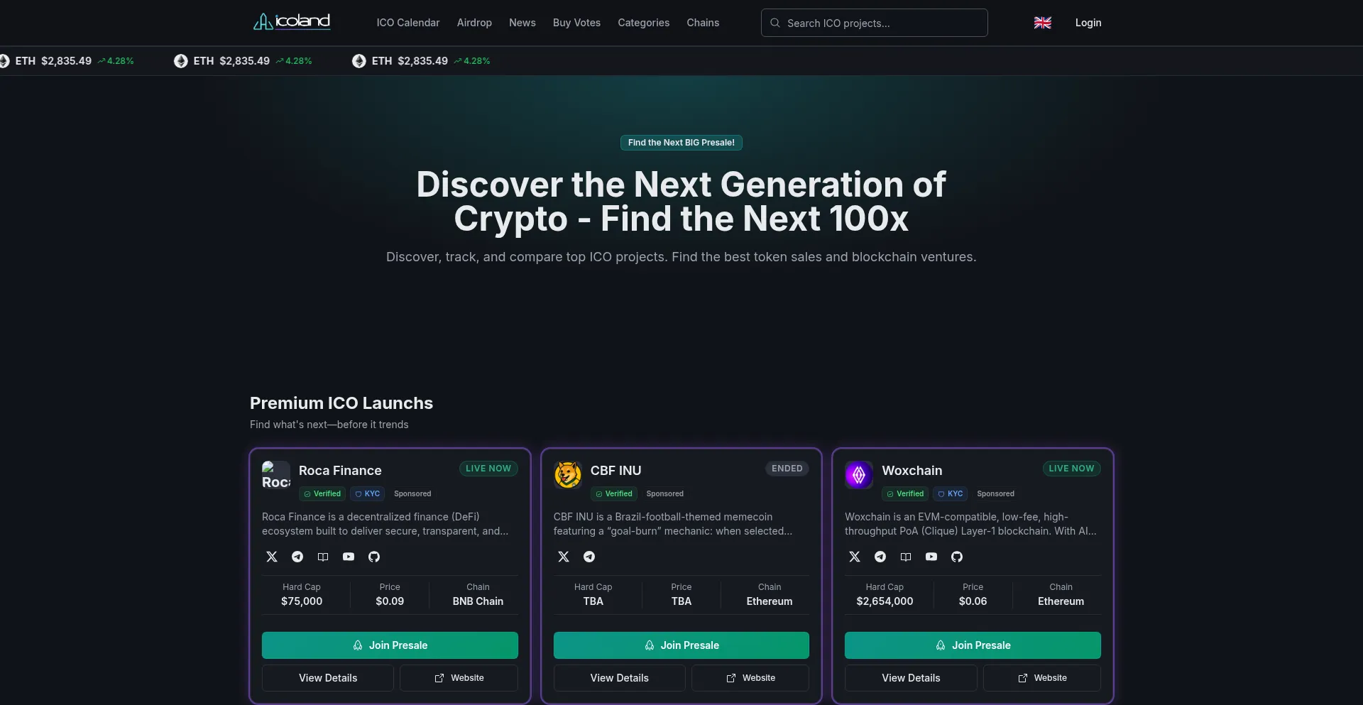 Discover top ICO, presale, and token sales. Comprehensive cryptocurrency investment platform with live ICO calendar, verified projects, tokenomics analysis, and blockchain launc...