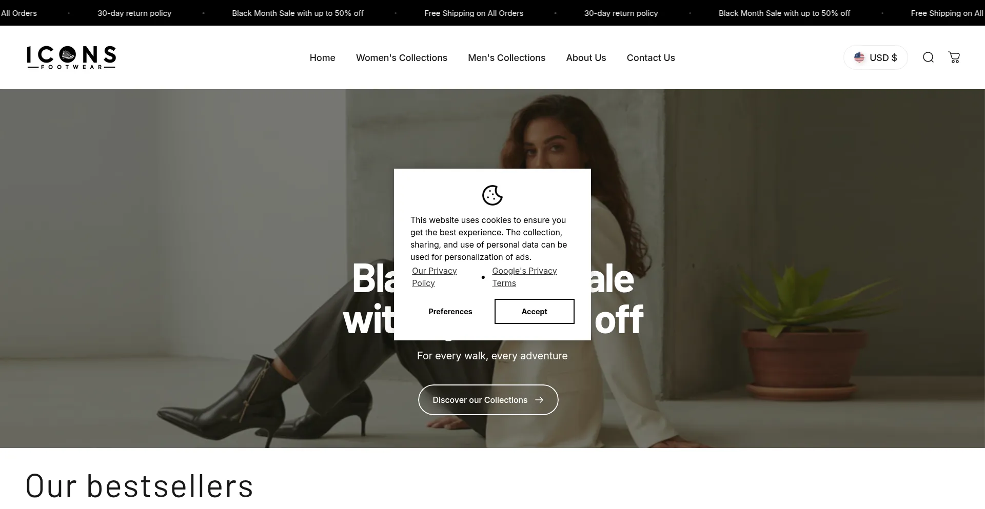 该网站实现符合GDPR或CCPA等隐私法规的cookie同意机制。这表明 iconsfootwear.com 遵守数据保护标准并为用户提供对个人数据收集实践的控制。