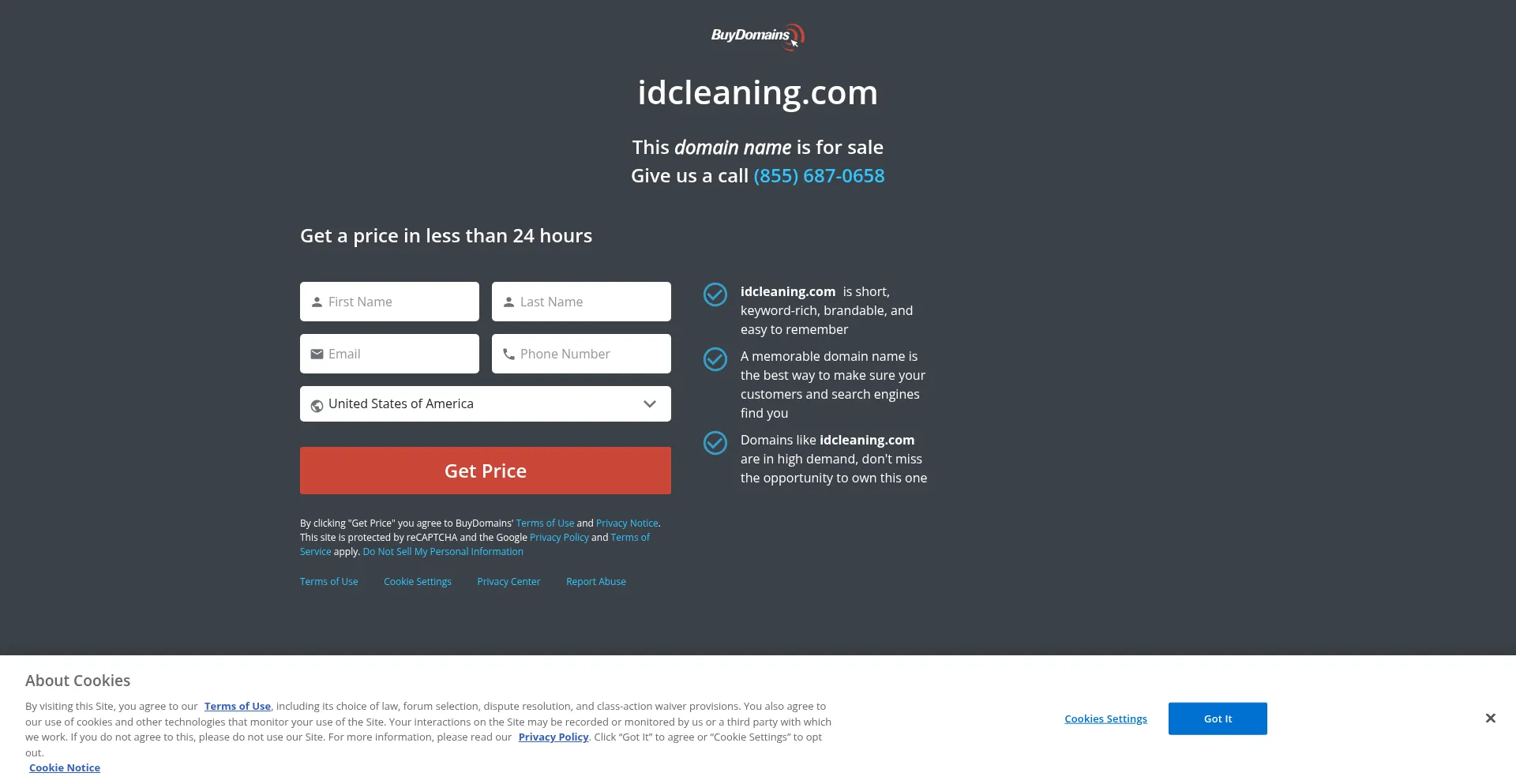 该网站实现数据收集表单,请求个人信息,包括姓名、电子邮件地址、电话号码或其他敏感详细信息。用户应验证 idcleaning.com 的合法性并在提交个人数据前查看隐私政策。